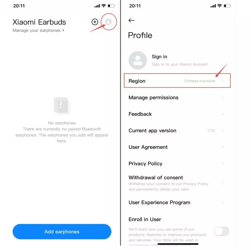Se quiser conectar o aplicativo "fones de ouvido xiaomi", é necessário mudar a região do aplicativo para a China,